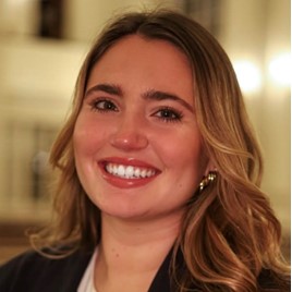 A smiling young woman named Grace Westerhuis, with shoulder-length wavy blonde hair and brown eyes, poses indoors against a softly lit elegant background with warm lighting. She wears gold hoop earrings and a black blazer over a white top.